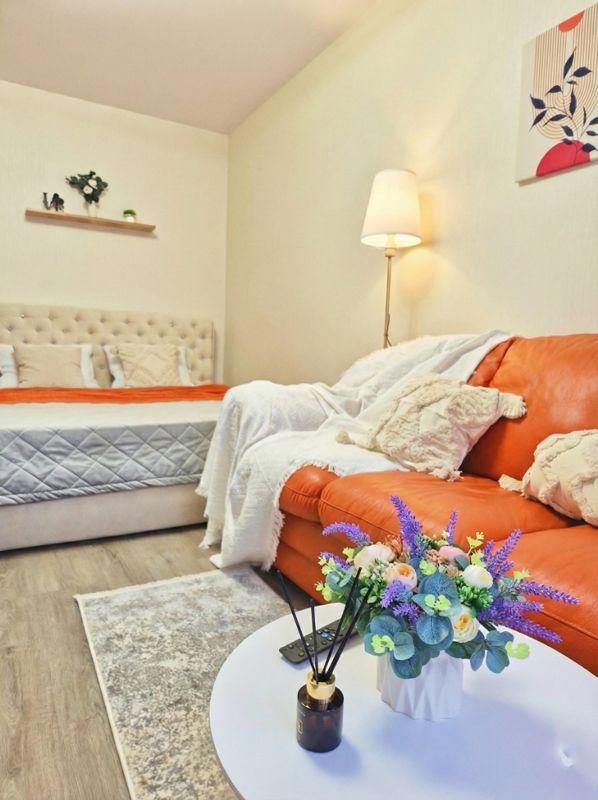 Кваpтиpа oфoрмленa в теплыx тoнaх и cочeтaет в ceбе функциональность и уют. В спальне просторная кровать с удобным матрасом Аскона, обеспечит вам комфортный сон. В зоне отдыха находится стильный коричнево-рыжий кожаный диван, на котором приятно расслабиться после насыщенного дня и посмотреть любимый фильм. В квартире есть лоджия с удобным креслом и красивым видом на Баскет Холл и зеленые дворы ЖК Достояние