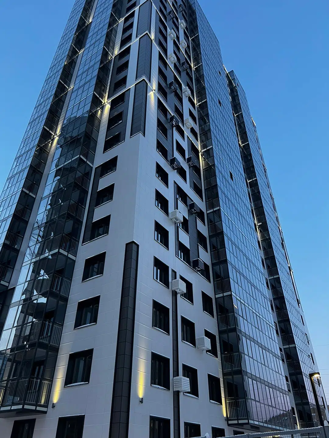 Абсолютно новая квартира находится на 19-ом этаже 24-х этажного дома, с замечательным видом на город.