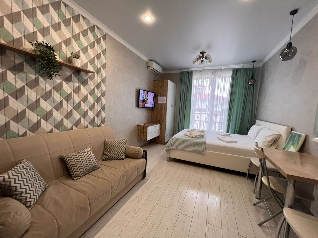 Вид из окон во двор, на детскую площадку и на парковую зону. Планировка в виде студии. Спальные места: двуспальная кровать и диван-кровать. 4 спальных места.