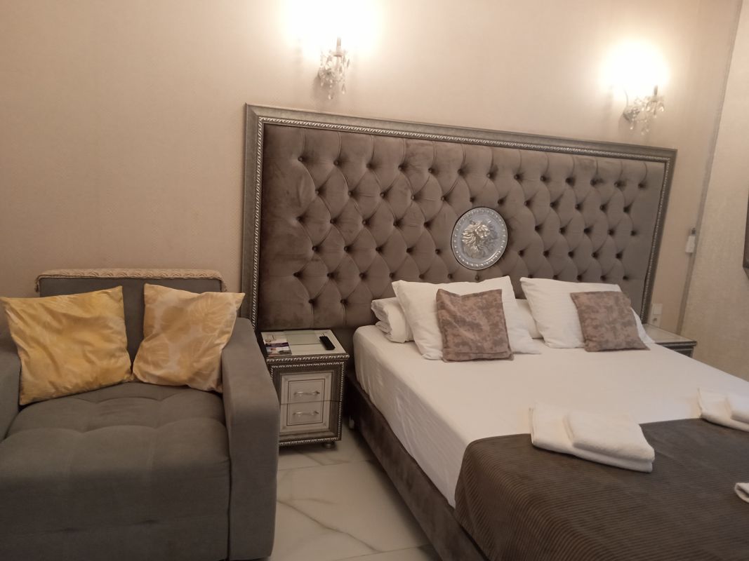 Апартамент с дизайнерским ремонтом уютно обставлен и оснащён всем необходимым для отдыха после долгого и насыщенного дня, в нем имеются: двухспальная кровать размера кингсайз, кресло-кровать (доп.место), телевизор, кондиционер, холодильник, сейф, чайная станция, в ванной тропический душ, фен.