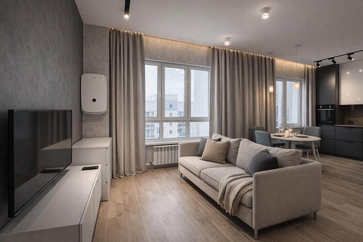 Премиальная студия ЧЕРНИКА для тех, кто любит порядок и эстетику: продуманное освещение, современная кухня и аккуратная отделка без лишнего шума!