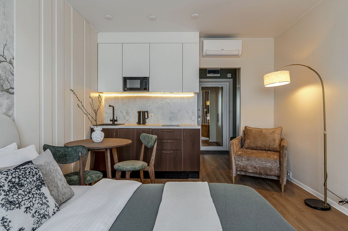 Апартаменты подойдут для размещения до 2 гостей. Внутри — полноценная мини-кухня с необходимой техникой, обеденная зона, комфортная кровать и зона отдыха с креслом. Панорамные окна наполняют пространство светом, а кондиционер обеспечивает комфорт в любое время года.