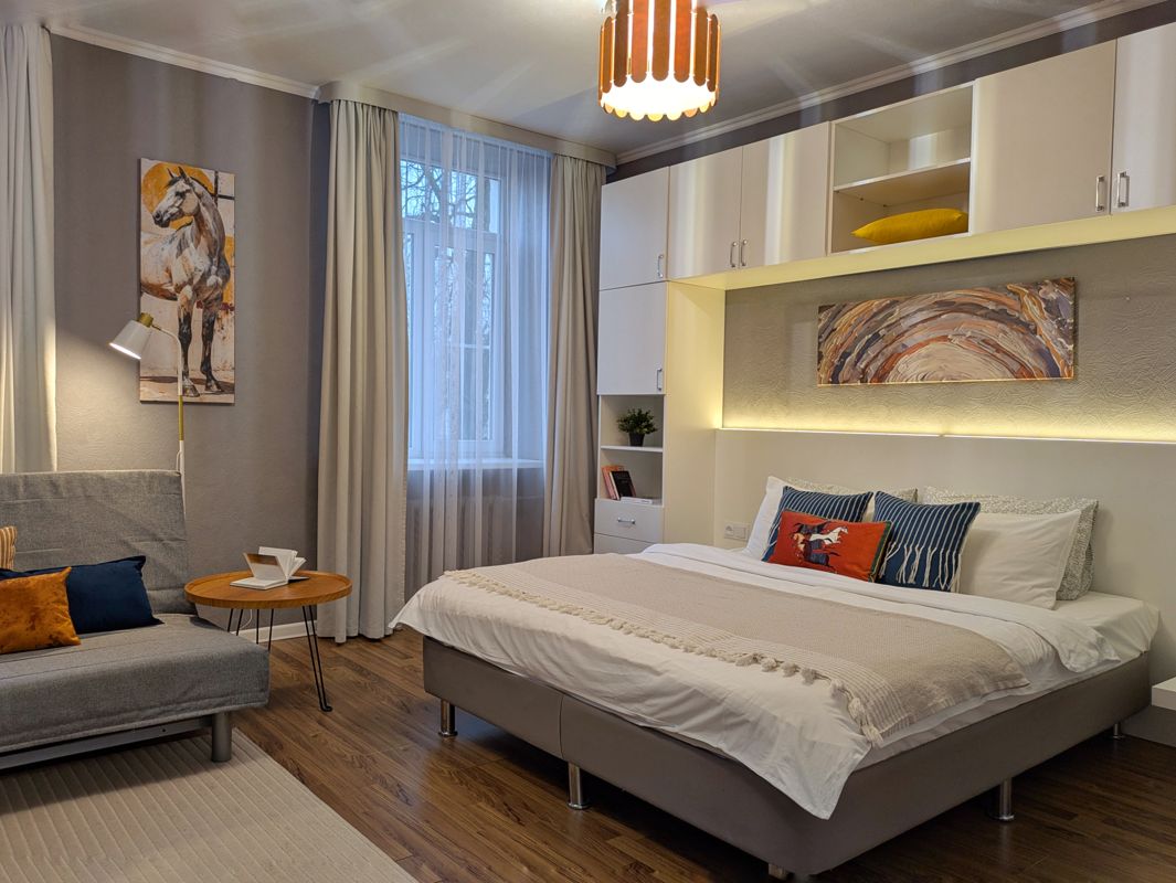 В качестве спального места у нас двуспальная кровать с удобным матрасом и раскладной диван. В студии для Вашего удобства есть кондиционер, фен, стиральная машина, утюг, гладильная доска. Мини кухня вмещает СВЧ, мультиварка, набор посуды, чайник, индукционная плитка и кофеварка.
