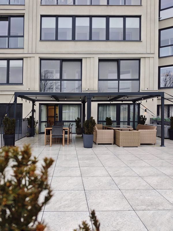 Терраса 70 м2. Закрыта от дождя и прямого солнца, подходит для круглогодичного использования.