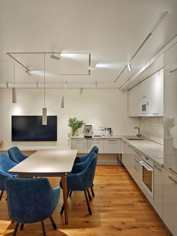 • гостиная, объединённая с кухней и столовой