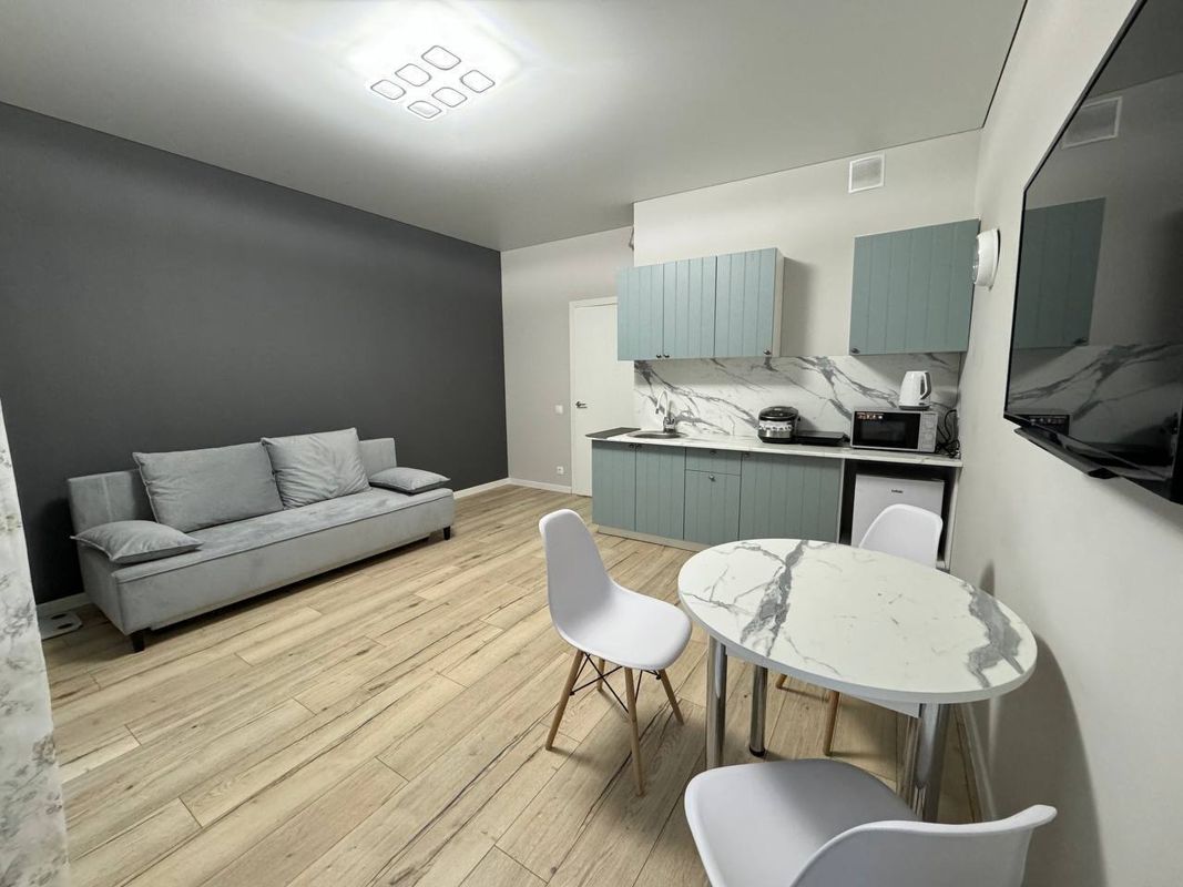 Студия оснащена всей необходимой мебелью и техникой-холодильник, микроволновка, чайник, посуда, стиральная машина с функцией сушки белья, ванные принадлежности, постельное бельё и средства личной гигиены, телевизор, wi-fi, фен, тапочки
