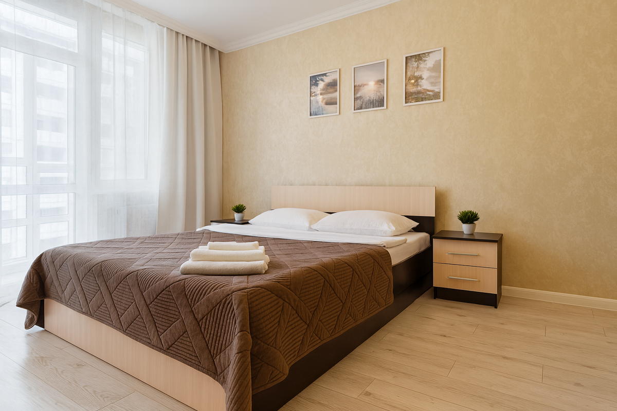 Современная светлая квартира в новом жилом районе. Выполнен качественный ремонт, имеется всё необходимое для комфортного временного проживания.