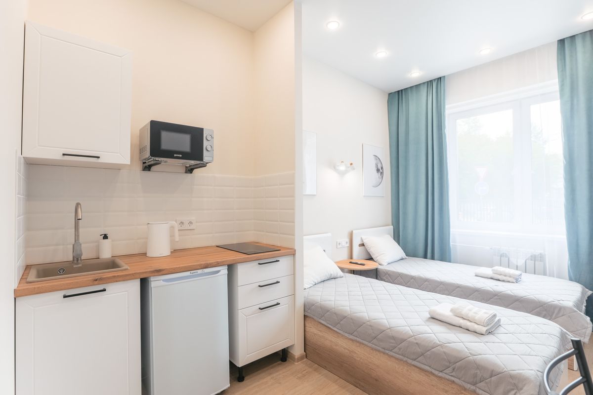 - полноценная кухня с плитой, холодильник, чайник, микроволновая печь, посуда, столовые приборы;
