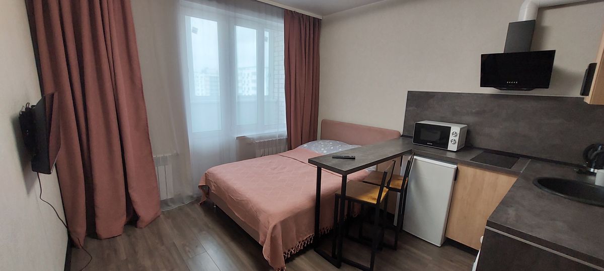 Сдается теплая, уютная квартира студия со всем необходимым для комфортного проживания. Магазины в доме. Общественная остановка во все направления города. Двор находится под видеонаблюдением 24 часа. Квартира для проживания максимально 2 гостей. Спальное место 1 двухспальная кровать 140×200 с ортопедическим матрасом.