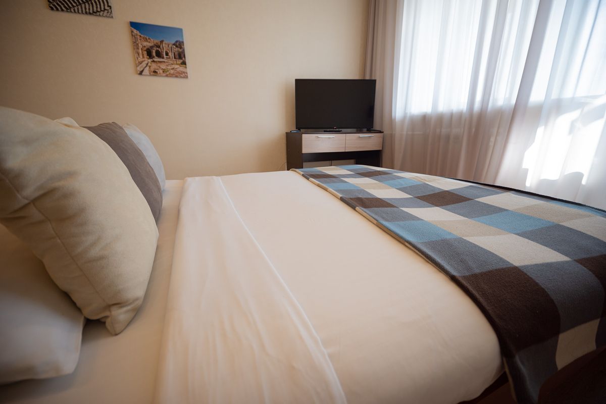 • Большая двуспальная кровать с качественным постельным бельем, матрасом и подушками, обеспечивающими здоровый и комфортный сон.