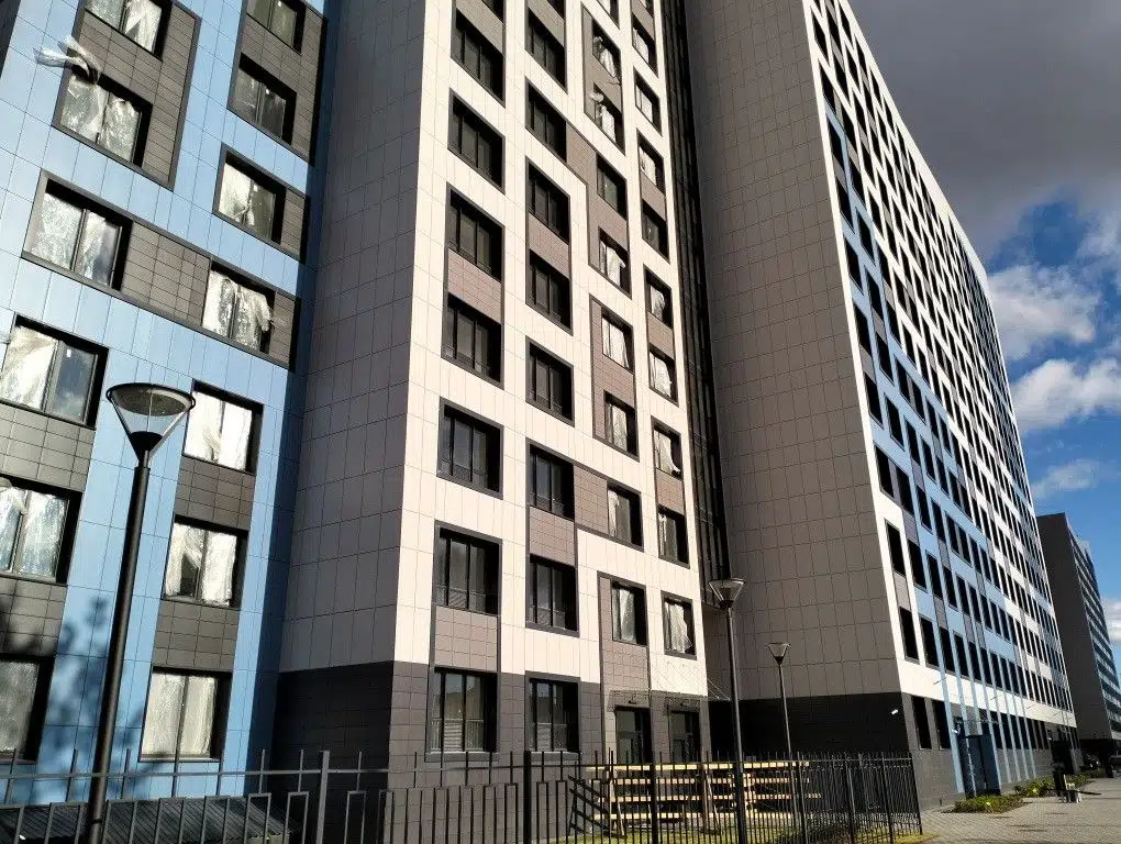 Многоквартирный современный дом с большим количеством лифтов, двумя детскими площадками и бесплатной парковкой для Вашего автомобиля .