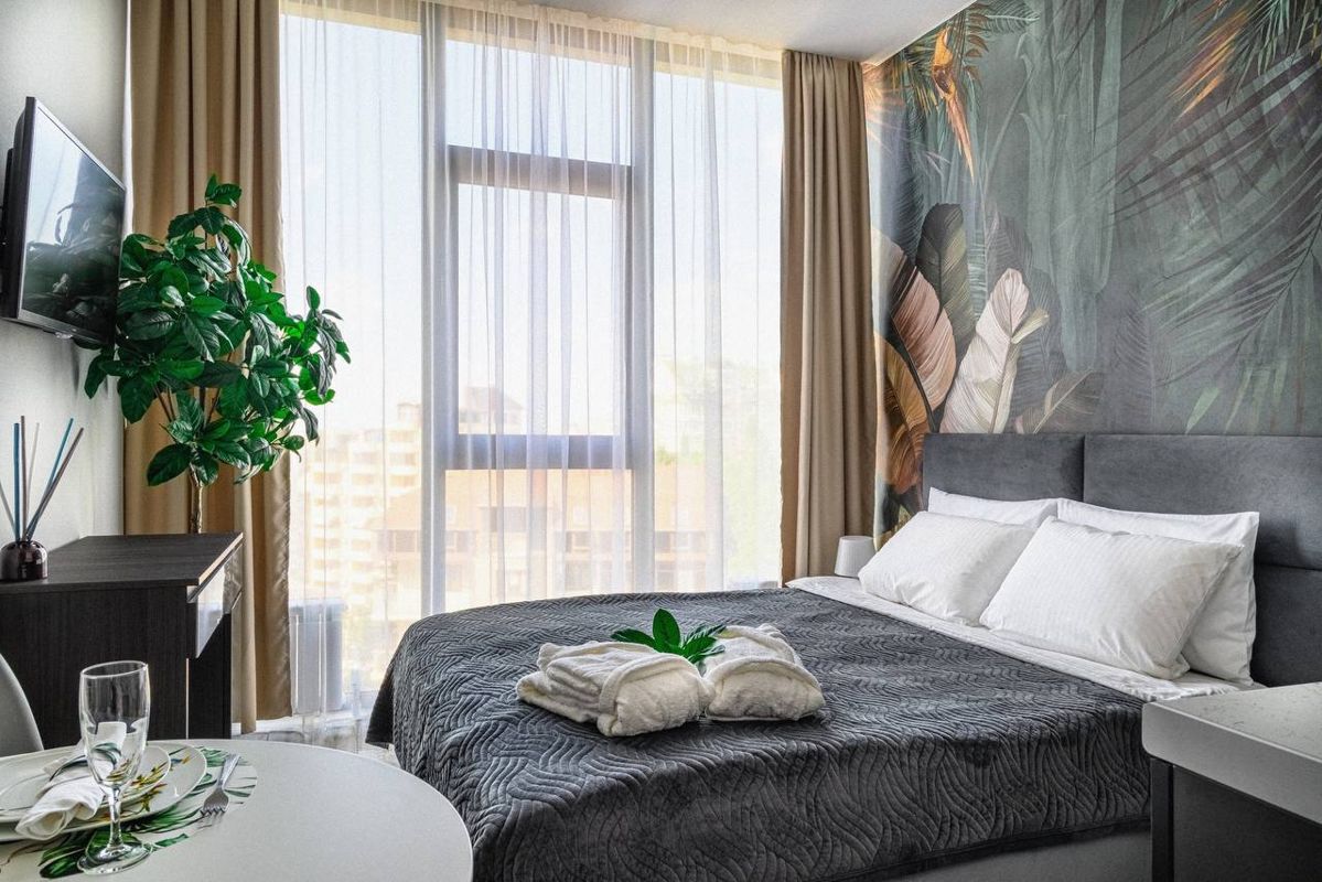 ОПИСАНИЕ АПАРТАМЕНТА: Новая стильная студия с повышенным уровнем сервиса в центре Сочи. Вас ждет панорамное остекление с видом на море. Двуспальная кровать ("King Size", матрас Аскона), белоснежное постельное белье как в дорогом отеле, гостевые наборы (тапочки, шампунь, гель /душа, полотенца, пледы и др.). Оснащенная кухня, техника, идеальная чистота и супер-комфорт.