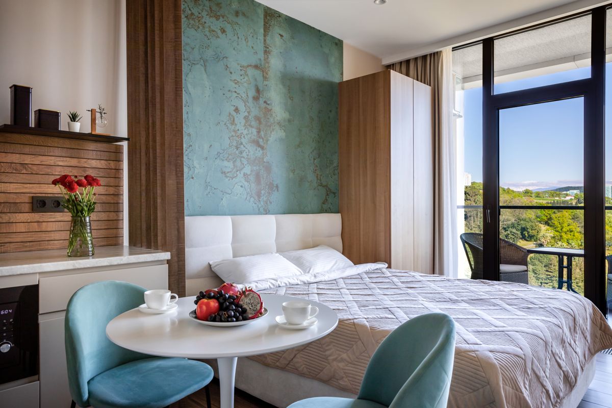 Современная студия с панорамным видом на парк Дендрарий и море.