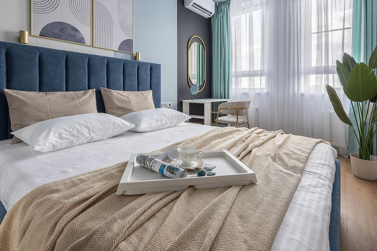 ✅ В спальне: кровать 160 см. с ортопедическим матрасом, премиальное белоснежное постельное белье, мягкие подушки и воздушные одеяла, полотенца. Кондиционер, смарт ТВ, Wi-Fi, рабочая зона/туалетный столик, шкаф.