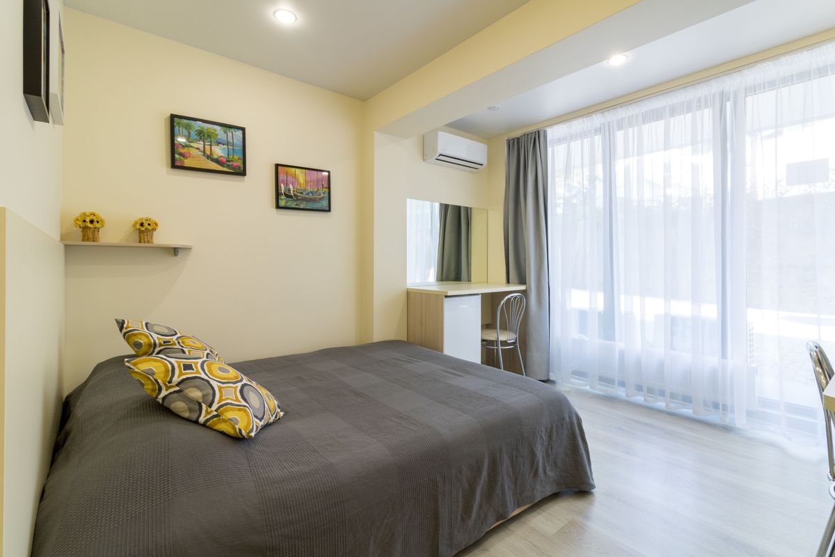 Апартаменты с двуспальной кроватью — идеальный вариант для деловой поездки или отдыха на море 1-2 гостей. Общая площадь – 20 кв. м. Для вашего удобства апартаменты оснащены современной мебелью и бытовой техникой. Расположены на 1 этаже с видом на внутренний дворик, имеют отдельный вход. Апартаменты имеют панорамное витражное остекление и москитную сетку. Рядом со входом в апартаменты выставлена плетенная мебель из ротанга.