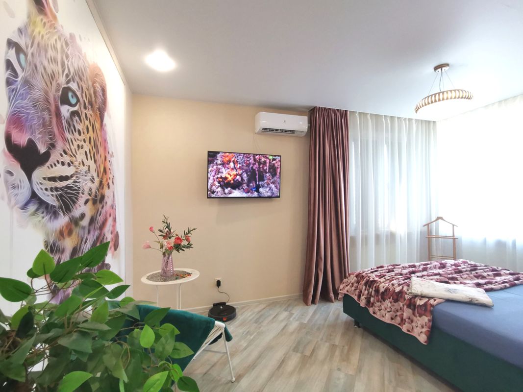 В квартире большая двуспальная кровать и раскладной диван. В комнате Смарт ТВ 47', в кухне ТВ с кабельными каналами.