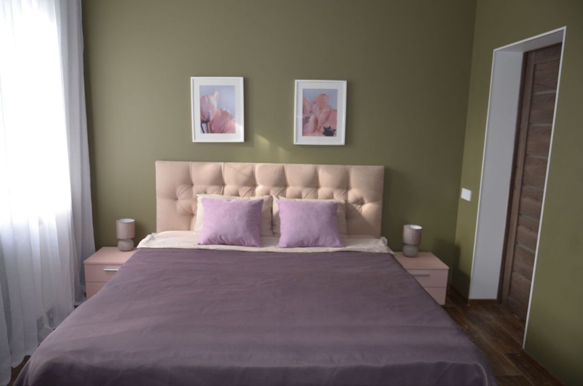 В спальне двуспальная кровать (180×200), в кухне-гостиной широкий двуспальный раскладной диван.