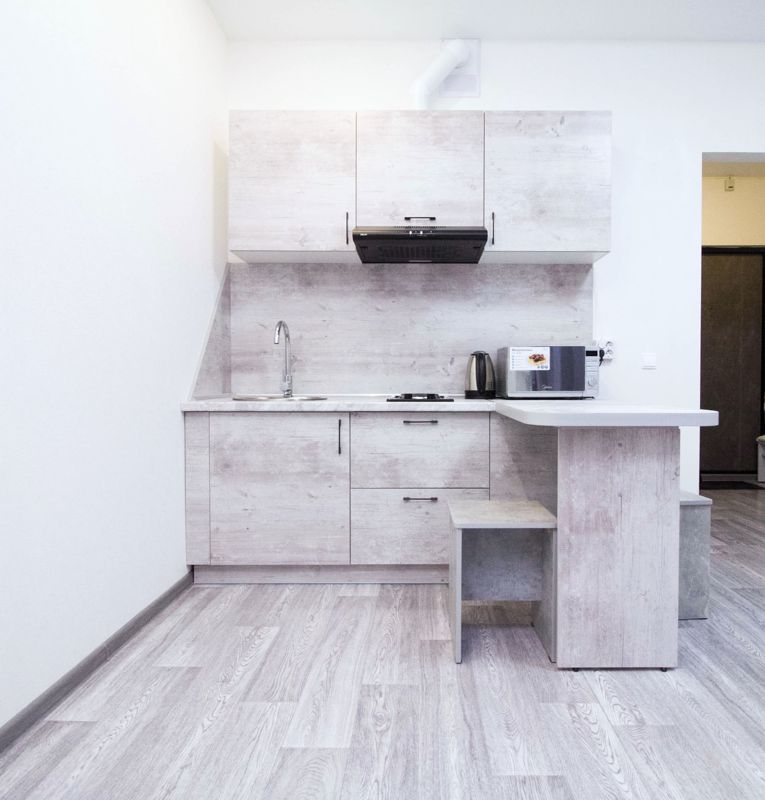 В студии есть плитка, чайник, холодильник, вытяжка, необходимый комплект посуды на двоих, стиральная машинка.