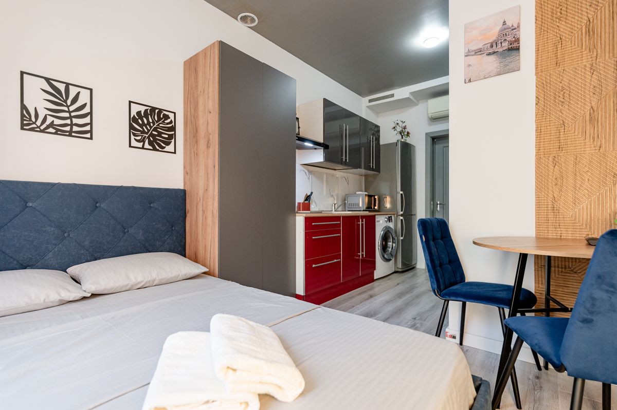 В студии для удобного проживания имеется современная мебель: двуспальная кровать, бытовая техника, скоростной WI-FI, Спутниковое ТВ, гладильная доска, сушка, оборудованная кухня, полный комплект посуды для приготовления и приёма еды