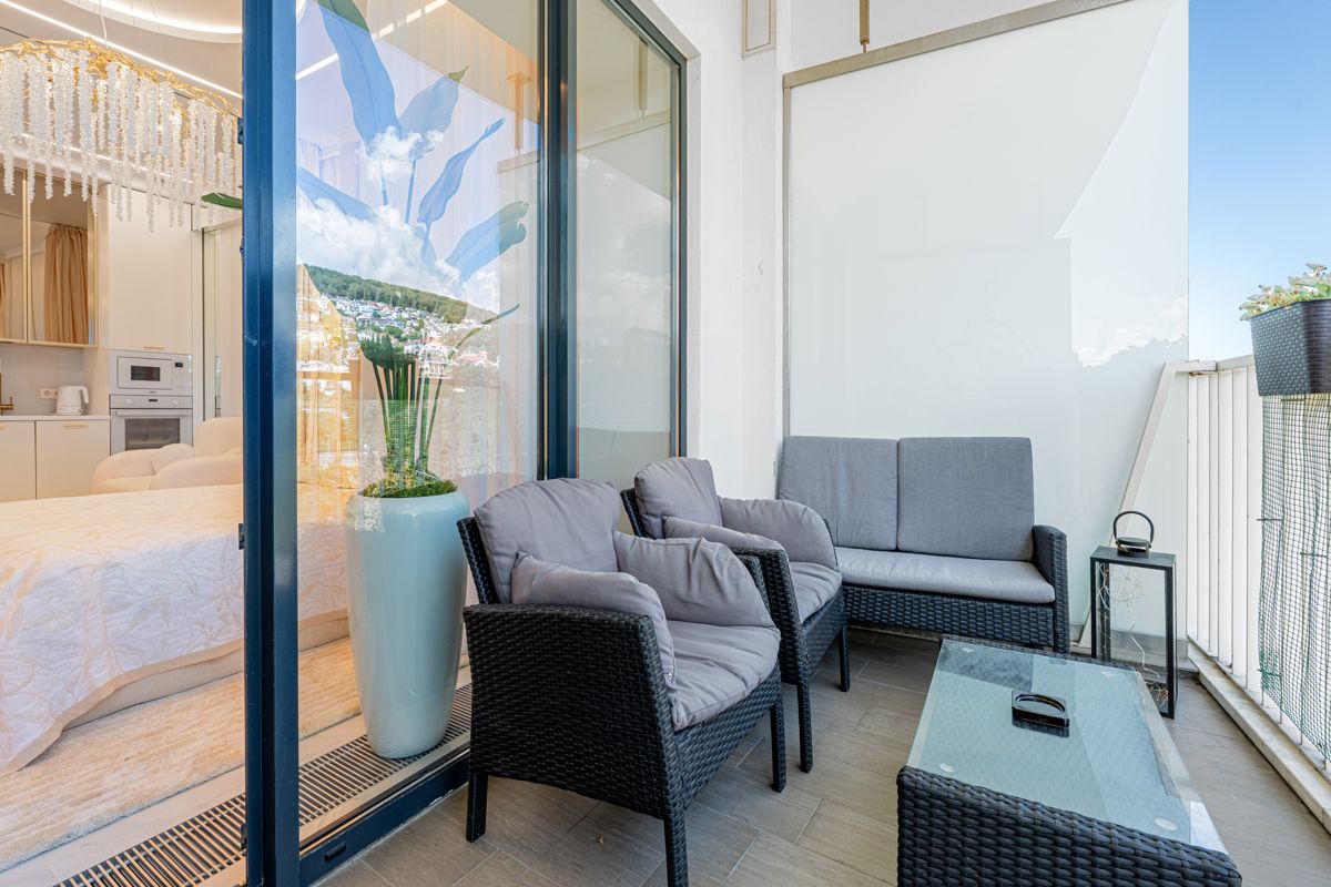 Предлагаем светлую студию площадью 41 м² на 9 этаже жилого комплекса Актер Гэлакси с уникальным мозаичным панно с белыми лилиями в ванной комнате. Студия выполнена в светлых тонах с золотистыми акцентами - смесители, ручки мебели и фурнитура создают элегантную атмосферу. Хрустальная люстра и белый круглый столик дополняют изысканный интерьер. Застекленная терраса с плетеной мебелью обеспечивает комфортный отдых на свежем воздухе. Расположение на 9 этаже гарантирует хорошие виды и естественное освещение. Студия идеально подходит для пары, ценящей художественные детали и элегантность.