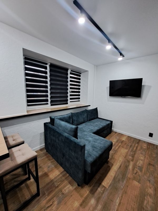 Площадь квартиры 31 м, она разделена на 1 спальню с двуспальной кроватью 140x200 и кухню-гостиную с диваном 120х200, комнаты раздельные, не смежные.