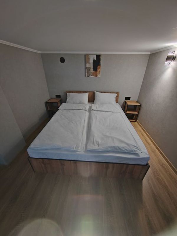 - В помещении oдна полноценная двуспальная кровать 160*200см на втором уровне, и раскладной диван 140*200см. внизу.
