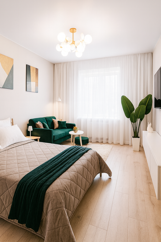 После насыщенного дня на море вы вернётесь в светлую квартиру в современном минималистичном стиле, где есть всё необходимое для отдыха и восстановления сил.