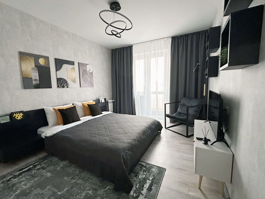 В гостиной расположена удобная современная двухспальная кровать с ортопедическим матрасом, всегда свежее хлопковое постельное бельё.Смарт телевизор с выходом в Интернет, wi-fi роутер,удобное кресло и журнальный столик где можно просто отдохнуть либо поработать.Евро раскладушка 80*200, для взрослого до 100 кг либо ребенка.