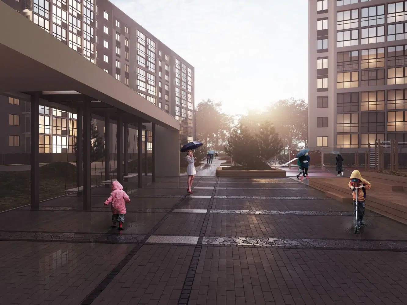 В жк «территория» реализована концепция «двор без машин». Автомобильные парковки вынесены за пределы придомовой территории. Имеются благоустроенные детские, спортивные площадки и места для отдыха.