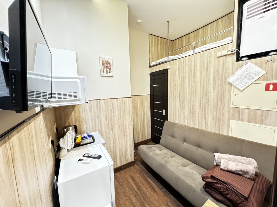 - в комнате: одноместный диван, одноместная кровать, телевизор (с кабельными каналами), кондиционер, белье, полотенце, одноразовые тапочки