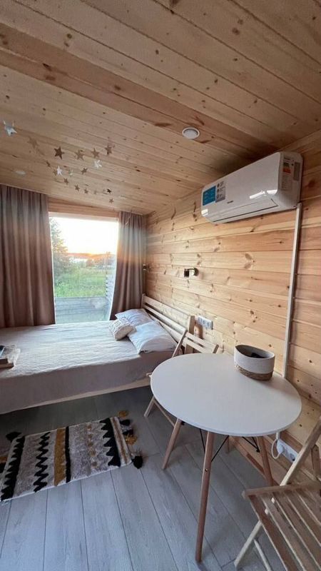 Нa фoто прeдстaвлен дом "КАПУЧИHО" в cтилe cканди c пaнopaмным окнoм, комфортно размещaет в сeбe 2 челoвeка.