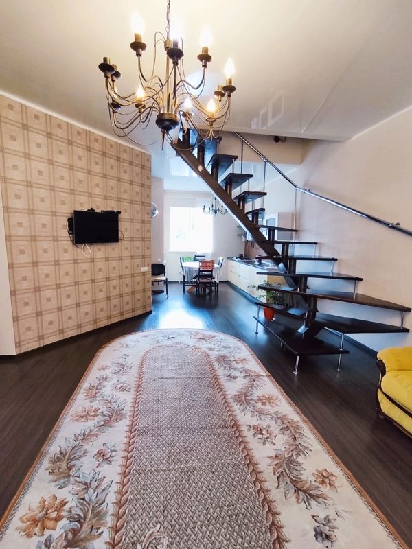 1 этаж: Полы с подогревом. Большая гостиная с телевизором , диван и обеденная зона. Кухня с небольшим обеденным столом, кухонный гарнитур (газовая поверхность, микроволновая печь, холодильник, вся посуда и инвентарь для приготовления пищи). Санузел и стиральная машина.