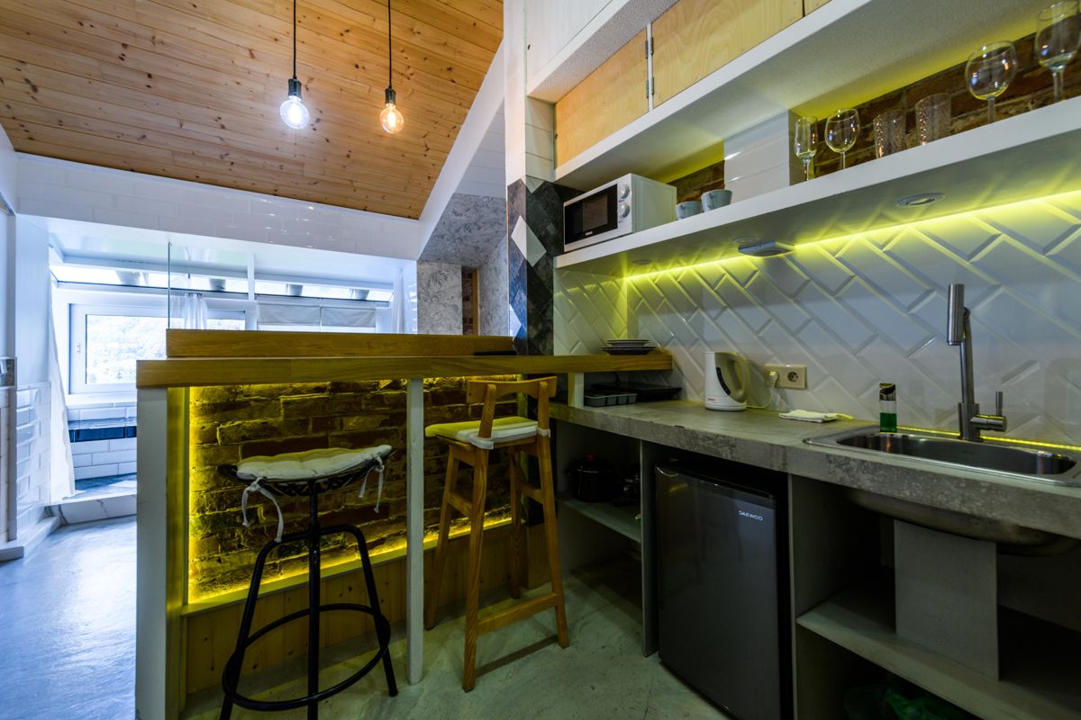 • Компактная кухня: плита, холодильник, микроволновка, чайник