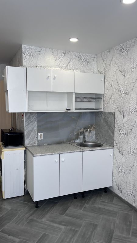 Сдается уютная студия на девятом этаже панельного дома. Дом оборудован консьержем и двумя пассажирскими лифтами, что обеспечивает дополнительный комфорт. В квартире выполнен косметический ремонт, стены украшены стильными обоями с растительным орнаментом.