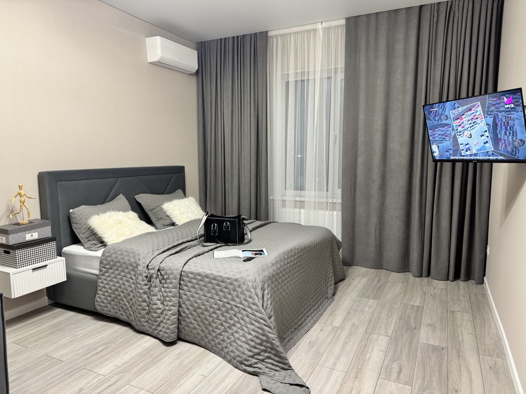 Очень просторная однокомнатная квартира в доме бизнес-класса. Отдельная изолированная спальня, в которой находится большая двуспальная кровать с ортопедическим матрасом, большая кухня, балкон с панорамным остеклением.