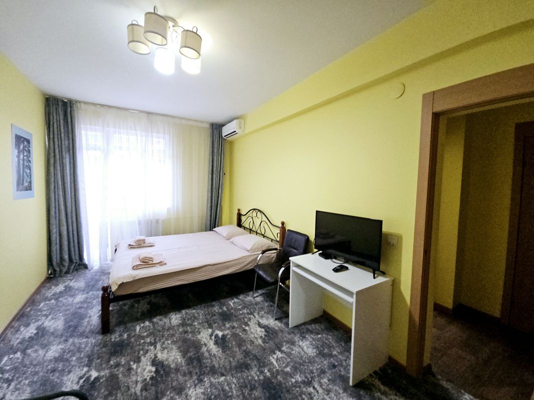 Апартаменты представляют собой большую однокомнатную квартиру . Находится на 3 этаже. Спальня и кухня - раздельные помещения с отдельными входами из коридора . В спальне : 2 спальная кровать и 1 спальная кровать, шкаф для одежды , письменный стол, телевизор. В кухне -гостиной - 2 спальный диван . Кухня оборудована всем необходимым- плита 3- комфорочная газовая , микроволновая печь, чайник , холодильник, посуда. Балкон полностью открытый , с балкона видны горы. В апартаментах центральное отопление, есть кондиционер. Санузел совмещенный , стиральная машина
