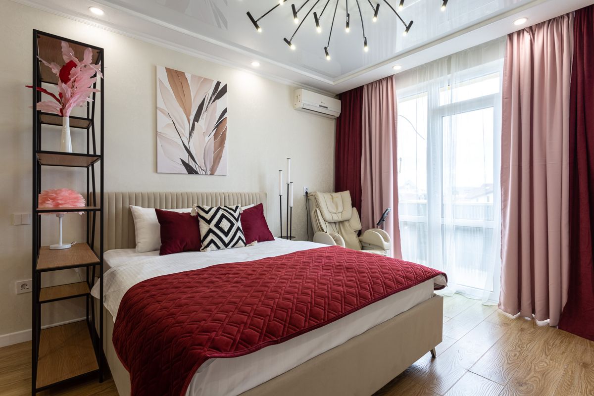 Просторная гостиная с выходом на балкон оснащена двуспальной кроватью шириной 160см с удобным анатомическим матрасом, шторы блэк-аут позволят вам выспаться по утрам. Массажное кресло, оснащенное различными программами массажа на разные зоны, для вас будет отличным релаксом (использование без ограничений).