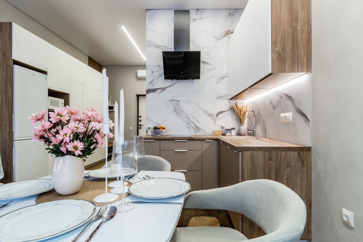 Кухонная зона оснащена всей необходимой посудой.