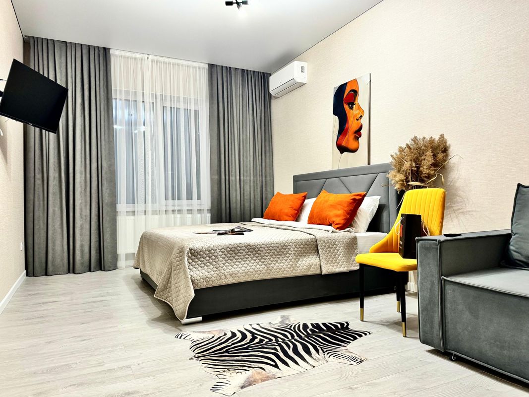 Очень просторная однокомнатная квартира в доме бизнес-класса. Отдельная изолированная спальня, в которой находится большая двуспальная кровать с ортопедическим матрасом, большая кухня, балкон с панорамным остеклением.