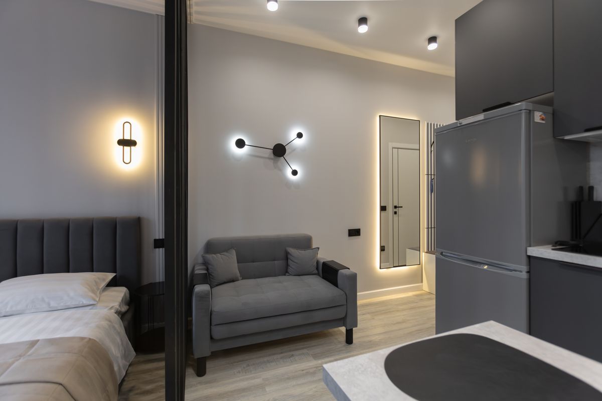 Интерьер выполнен в современном стиле: отдельная спальная зона, комфортная мебель и приятное освещение создают атмосферу уюта и отдыха после насыщенного дня.