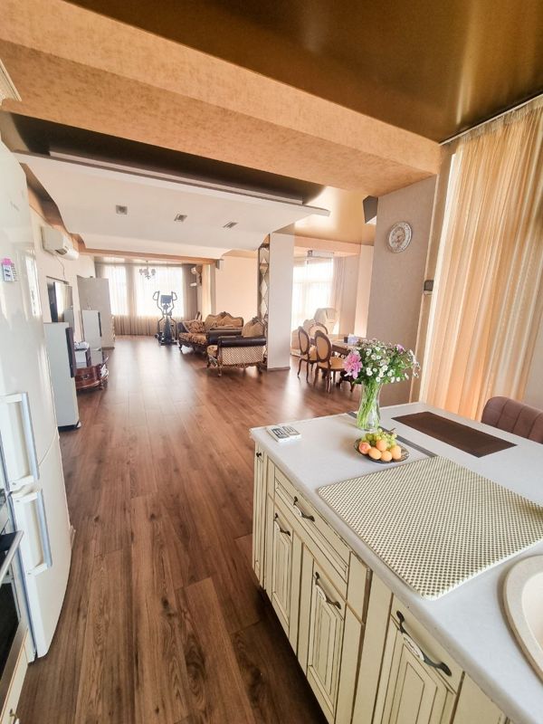 ▪️и большой зал совмещенный с кухней, большой стол со стульями, диван, барная стойка, кресло.