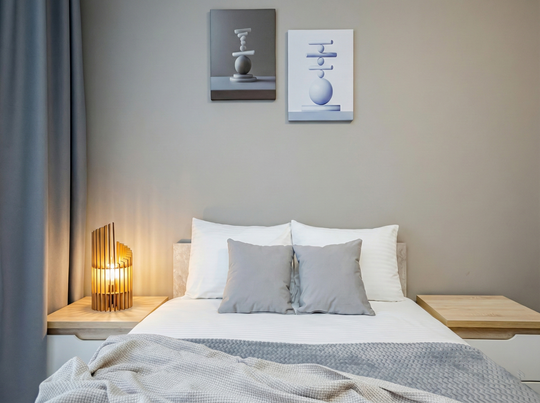 — Двуспальная кровать с ортопедическим матрасом и нежным постельным бельём из сатина