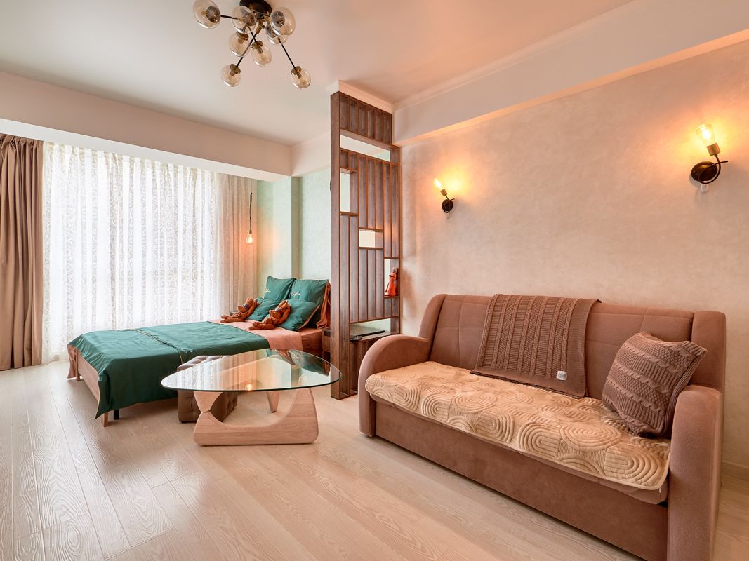 Квартира рассчитана на 4 человека (детская кровать и доп. место организуем): в комнате двуспальная кровать, раздвижной диван в комнате и кухонной зоне.