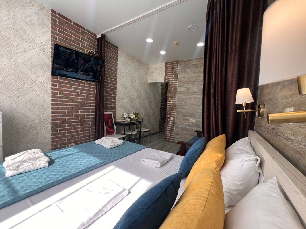 Вид из окон во двор, на детскую площадку и на парковую зону. Планировка в виде студии. Спальные места: двуспальная кровать и диван-кровать. 4 спальных места.