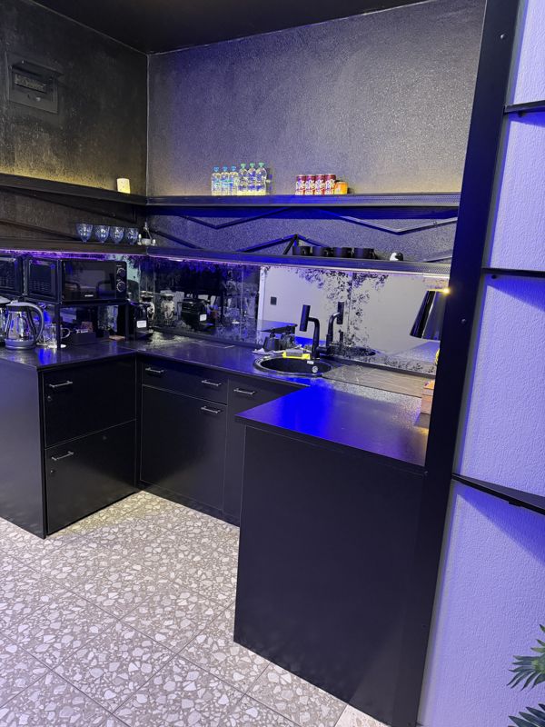 Квартира с необычными световыми подсветками и черными деталями интерьера, кухней-гостиной и огромной ванной-джакузи.