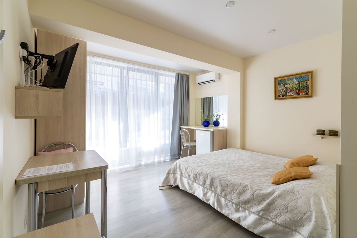 Апартаменты с двуспальной кроватью — идеальный вариант для деловой поездки или отдыха на море 1-2 гостей. Общая площадь – 20 кв. м. Для вашего удобства апартаменты оснащены современной мебелью и бытовой техникой. Расположены на 1 этаже с видом на внутренний дворик, имеют отдельный вход. Апартаменты имеют панорамное витражное остекление и москитную сетку. Рядом с апартаментами выставлена ротанговая мебель.