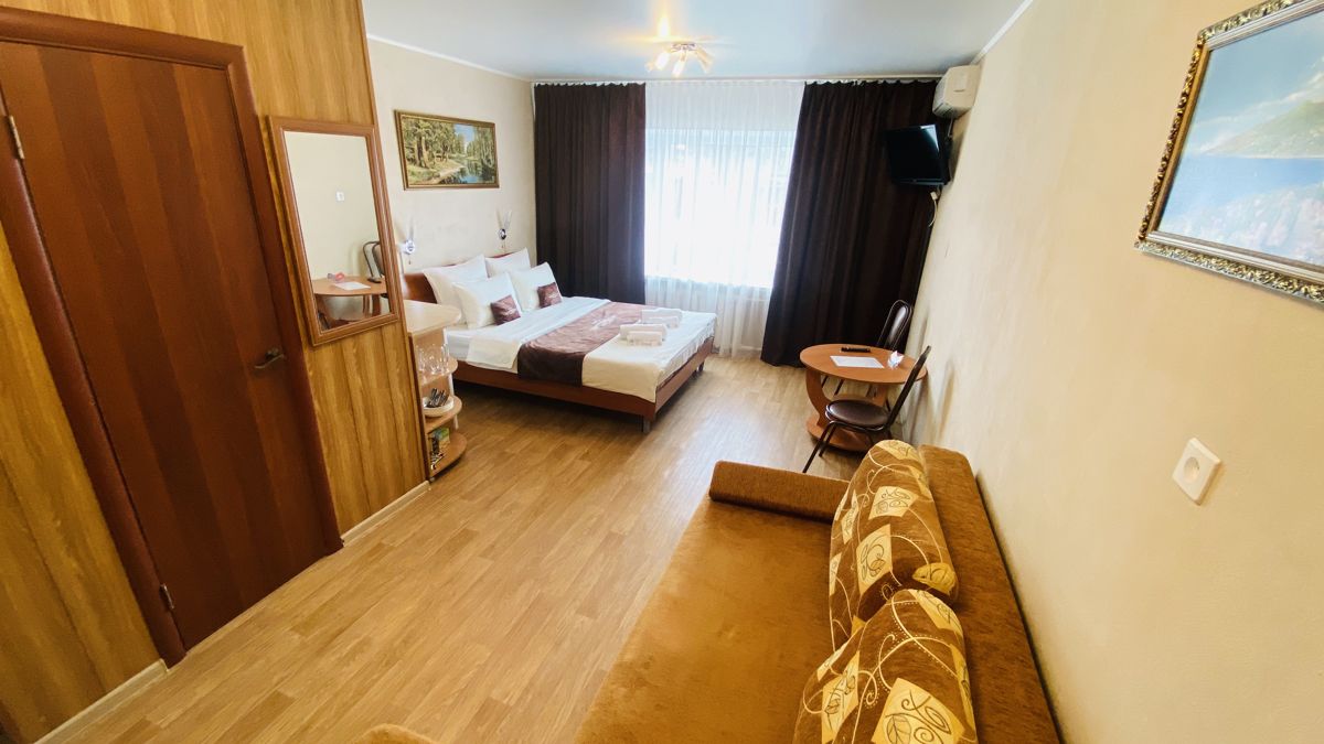 Номер с удобствами. Двухспальная кровать и двухспальный диван . Вай фай, жк кВ, сплит система, холодильник, свч, посуда, есть кухня для приготовления еды, одноразовые средства для душа.