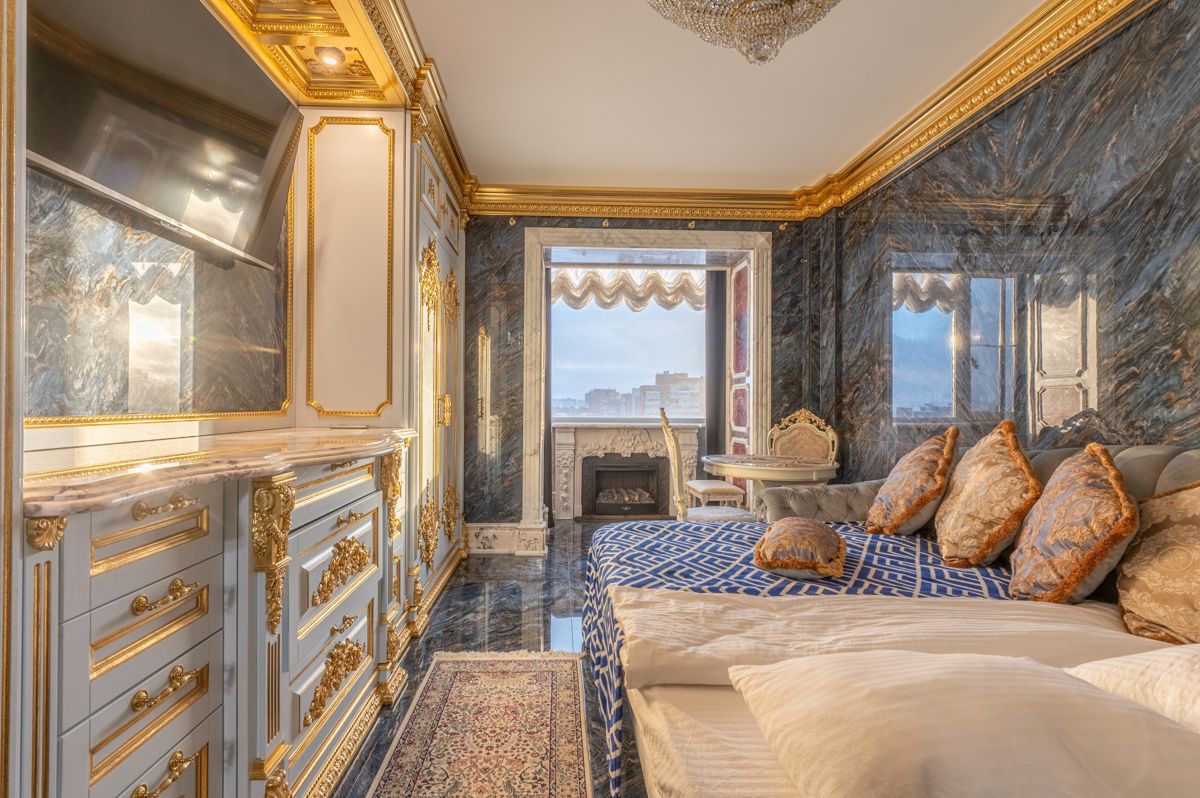 Интерьер выполнен в стиле барокко с использованием натурального мрамора, декоративной лепнины и авторской мебели, создающих ощущение премиального пространства.