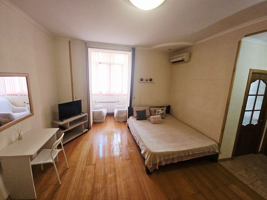 Стандартная однокомнатная квартира . Спальня и кухня- отдельные помещения и разделены дверью. В комнате - 2 спальный диван и 2 спальная -кровать, телевизор. По запросу возможно дополнительно поставить 1 спальную кровать или детскую кровать-манеж. Кухня: плита , микроволновая печь, чайник, холодильник, посуда . Санузел: ванна , туалет, раковина, стиральная машина. Лоджия - застекленная. Отопление. водоснабжение - центральное. Кондиционер- есть.