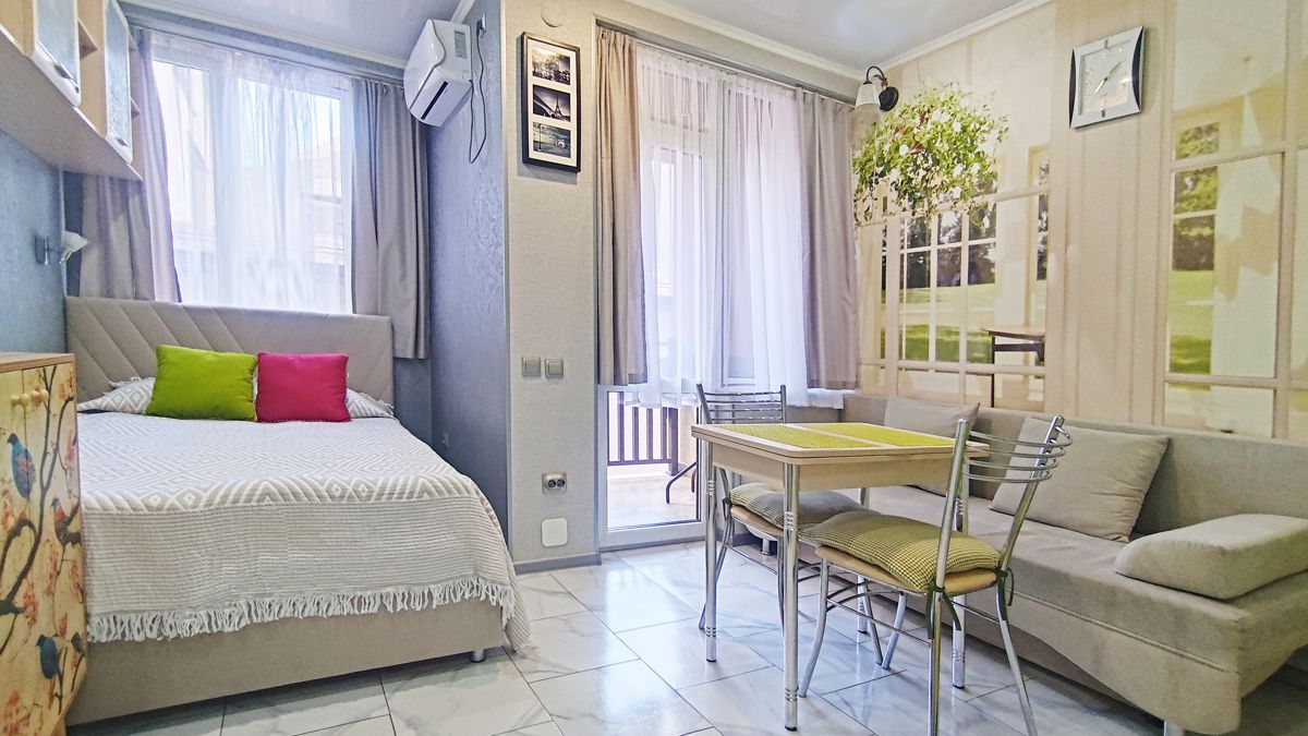 👉 это уютная квартира-студия площадью 25 м2. Расположена на 3 этаже трёхэтажного дома. Открытый балкон. Есть вид на горы.